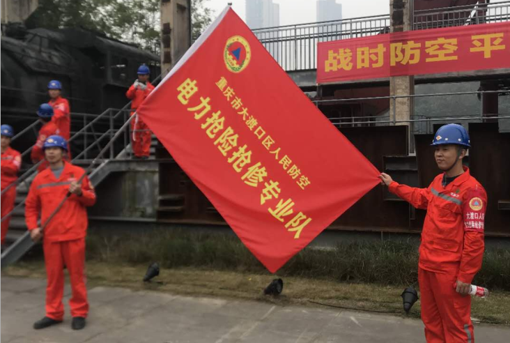 重慶大渡口區人民防空辦公室組織的大渡口區2019年人民防空專業隊伍 防空襲綜合演練:現在進入現場的是我區電力搶險搶修專業隊,這支專業隊由重慶寶翼電力設備維護有限公司組建。戰時該專業隊主要負責城市電力應急供應及電力中斷恢復任務,本次演練主要負責電力系統受損時的恢復工作。